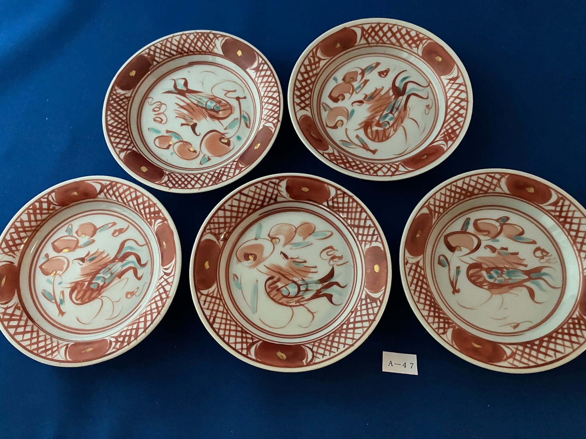 赤い鳥がダンスしているようで動きがある。皿の縁まわりには丸い花と籠目文様