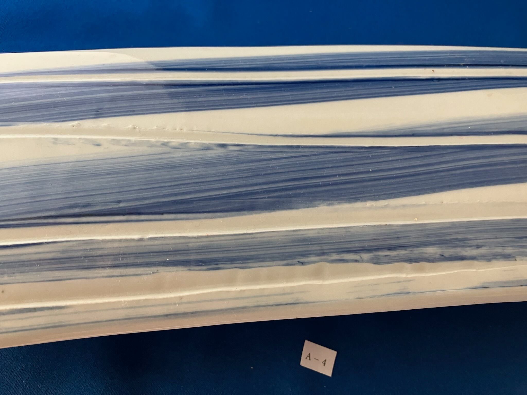 直径50センチほどの大きさで轆轤をひくことはどんなにか大変なことか。ひいた轆轤を箱の蓋のために切り落とすことの勇気ある赤地氏の決断に頭が下がる。しかも蓋の表には轆轤目の跡に加えて鋭い水跡を残す技。染付のグラデーションの蓋を開けると草々に金の幸せ鳥が水面の下で遊んでいる風景。