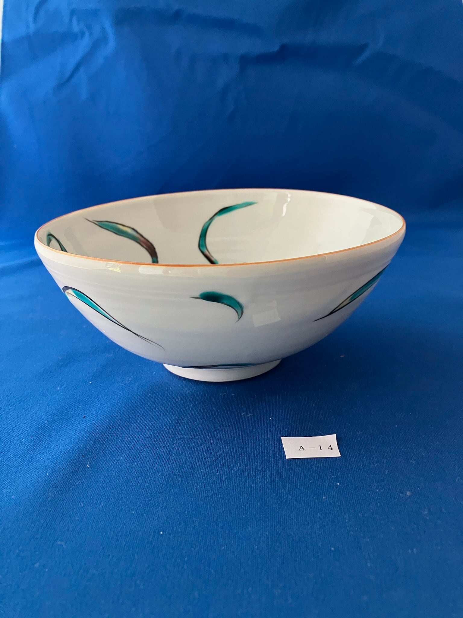 轆轤を回したら日本一と言われる赤地健の技が生きている大碗。緑の葉に紫色を加えて萱の葉の動きを醸し出している。